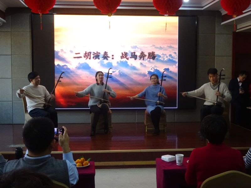 緊接著大家精心準(zhǔn)備的節(jié)目開始演出,精彩紛呈,讓人目不暇接。熱情洋溢的開場歌舞,悠揚(yáng)動聽的二胡演奏,美輪美奐的各種舞蹈,或優(yōu)雅或高亢的歌聲,讓人捧腹的相聲小品,大家盡情欣賞,樂在其中。中間還穿插了抽獎和游戲環(huán)節(jié),更是不斷掀起年會的高潮。
